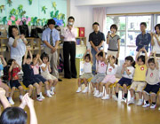 幼稚園での様子をお父様にご覧いただき、一緒にゲームやダンスを楽しみました。園児達が一生懸命作った作品や歌のプレゼントに、お父様はとても喜んでくださいました。 |