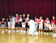 みんなからの「おめでとうございます」の言葉に、うれしそうに「ありがとうございます」と元気に答えた5月生まれのお友達。赤いお花にお誕生日の本とスケッチブックが贈られました。 |