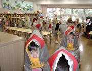 地震発生の放送が流れると、全員が静かに先生のお話を聞き、落ち着いた雰囲気で訓練が始まりました。座布団を広げて防災頭巾にしてかぶると、速やかに避難できました。 |