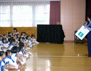 親子交通安全教室では、保護者への諸注意とビデオ「お手本はあなたです。」の上映がありました。その後行われた腹話術での交通ルールの確認に、園児たちは正しく答えが言えました。 |