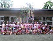 学年ごとに、今年も大きくてきれいな七夕飾りをみんなで協力して作り上げました。先生にお手伝いしてもらって、みんなの色々なお願い事を書いた色紙や、輪飾りなどで飾り付けました。 |