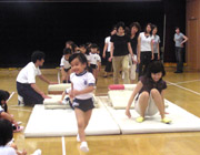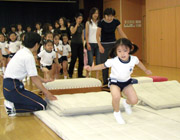 キンダーファミリーパーティーの夏休み中の練習にむけ、おうちの方には側転やブリッジの補助の仕方が指導されました。最後は親子で飛び込み前転競争を行い、大いに盛り上がりました。 |