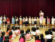 終業式を直前に控え、7・8月合同のお誕生会が行われました。18名のお誕生者は、みんなからのお祝いの言葉に「ありがとうございます。」と、とてもうれしそうにお返事をしていました。 |