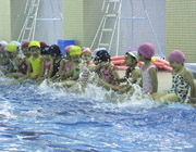 年少組と年中組の希望者を対象に、合同でプール教室を行いました。年少組は初めてのプール教室なので水を怖がる園児もいましたが、楽しく遊びながら少しずつ水に慣れていきました。 |
