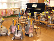 「大きな地震が発生しました」との放送があった時も、みんな落ち着いて防災頭巾をかぶり、先生のお話を聞くことができました。年少組にとっては初めてのゆうぎ室移動も静かにできました。 |