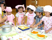年長組が初めてのお料理教室を実施。この日にむけて、おうちで包丁の使い方を練習してきたお友達もいました。フルーツのたっぷり入ったゼリーを冷やすと、夏の太陽のような輝きが加わりました。