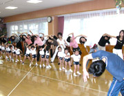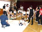 さすが年長組ともなると動きも俊敏になってきます。我が子の柔軟な身のこなしに、お母様は皆びっくりしていました。最後はお母様と園児達の飛び込み前転競争もしました。 |