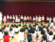 7月の誕生会は翌8月が夏休みのため、7月生まれと8月生まれの両方の園児合計17人を対象に行われました。みんなでお誕生日を祝福した後、年少組と年中・年長組がペアになりダンスを楽しみました。 |