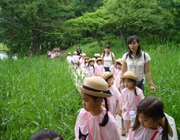 年長組は、いよいよ蓼科修養会の日を迎えました。最初の活動となった女神湖畔から山荘までのハイキングでは、自分の背丈ほどある植物の生い茂った木道や木々の中を歩き、自然の中で冒険気分を楽しみました。 |