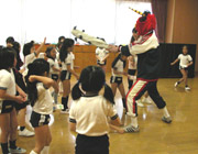 はじめに全員が張り子で作ったかわいい鬼のお面をかぶって豆をまきました。その後突然現れた鬼に子どもたちもびっくり。こわくて逃げ回ったりもしましたが、「鬼は外!福は内!」と大きな声で豆をまいて、鬼を追い出すことができました。 |
