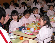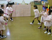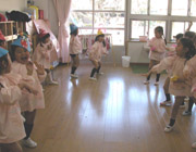 「春になる前にみんなの心の中の弱虫鬼やいじわる鬼、悪い鬼を追い出してしまいましょう!」という先生のお話の後、手作りのかわいいお面をつけ、鬼役を交代しながら今年も元気に豆をまきました。元気な「鬼は外!」のかけ声に、さすがの鬼も「まいったまいった・・・」と逃げ出しました。 |