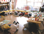 今年度最後の避難訓練を行いました。地震が発生しました、という放送があると先生の指示どおり、すばやく椅子や机の下に隠れることができました。その後全員がゆうぎ室に集まって、幼稚園にある非常食などを見せていただき、園児たちは安心したようでした。 |