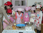 年長組の最後のお料理教室はカレーに挑戦しました。にんじん、じゃがいも、たまねぎを一人ずつ順番に包丁で切りました。年中・年少さんもおねえさんたちの作るカレーのおいしそうなにおいにつられて見に来ていました。みんなで「もっともっとおいしくなあれ!」とお祈りしながら作ったカレー、おかあさんのカレーとどちらがおいしいかな? |