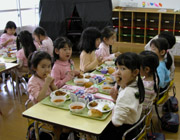 年長組のおねえさんたちの給食が始まりました。おいしそうなにおいでいっぱいのお部屋の中で、みんな楽しそうに給食をほおばっていました。おともだちと一緒に楽しくいただくと、いつもよりたくさん食べられそうです。たくさん食べて大きくなあれ。 |