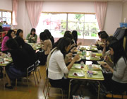 年長組の保護者による給食試食会が行われました。和やかな雰囲気の中、園児と同じメニュー(シーフードスパゲティ、シーザーサラダ、いちご、牛乳)の給食を味わっていただきました。 |