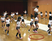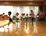 年長組の体操教室がいよいよスタートしました。先生の掛け声やたいこの音に合わせ、元気に跳んだり行進したり、マットの上で前転をしたりもしました。秋のキンダーファミリーパーティーが今から楽しみです。 |