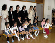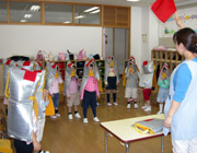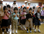 5月の避難訓練は地震発生の想定で行われ、防災頭巾を被って口元を押さえ、ゆうぎ室へ集まりました。中国で大地震があって間もないため不安を抱いている園児もいたようですが、「幼稚園では災害に備えて食べ物や飲み物などを用意しているので、心配しないでおうちの方がお迎えに来るまで待ちましょう。」という副園長先生のお話に、ほっとした表情を浮かべていました。 |