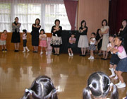 5月の誕生会が行われました。今月は20人のお友達がお誕生日を迎えました。ちょっぴり恥ずかしそうでしたが、みんなきちんと大きな声で名前を言い、大きくなったらなりたいものを発表できました。誕生会の後は年長組の先生がパネルシアターをしてくださいました。 |