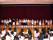 | 幼稚園児から大学生まで各校の代表が集まり、母の日のお祝いをしました。在校生代表からの挨拶の後、小学校副校長より「皆さんも健康に気を付け、勉強に、スポーツにしっかりと励んでください。」とご挨拶がありました。 |
