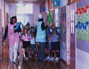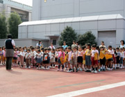 10月の避難訓練は地震に対する訓練でした。大きな地震が発生したとの放送で、各保育室ではみんなが素早く防災頭巾を被り、椅子や机の下に身を隠しました。揺れが収まったとの連絡を受けて、全園児が園庭に集合し、先生の誘導に従って住宅街を素早く静かに移動し、中高の広い第一グラウンドに無事集合することができました。避難訓練も回を重ねるごとに、年少さんも素早く動くことができるようになっています。 |