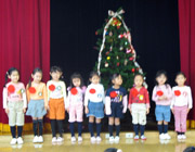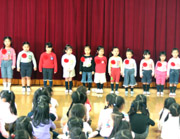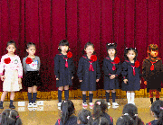 12月の誕生会が行われ、全部で9人のお友だちが皆からお祝いされました。誕生会の後のお楽しみ会では、ストーリーと音楽に合わせてボードにかわいらしい絵を次々と貼ったりはがしたりする、年少組の先生方によるパネルシアターが行われました。ネズミがお相撲をとるおもしろいお話に、園児たちはもう大喜びでした。 |