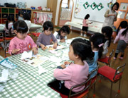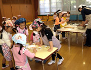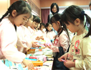 年少さんから年長さんまでこの日のために皆で協力し、6つのお店やさんで売るおべんとう、ぶんぼうぐ、アクセサリー、おかし、でんきせいひんを心をこめて作りました。お誕生会が終わった後、お店の人と、お買い物をする人を全員が両方体験できるように交代して行い、「いらっしゃいませ」と元気な声で呼び込みをしたり、350円分の紙で作ったお金を大事に使ってお買い物をしたりと、今日はちょっぴり大人の気分を味わいました。 |