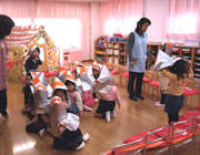 年少組も防災頭巾を素早く被り、静かに避難。