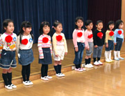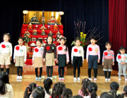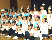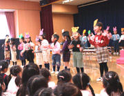 おわかれ会では、優しくお世話をしてくれた年長組のお姉さんに喜んでいただこうと、年少・年中組はオペレッタを披露しました。年少組は「三匹のくま」を園児と大勢の保護者の前で、ますますやる気を見せて、元気いっぱい堂々と発表できました。年長組からは「かわいかった」との感想が上がっていました。 |