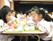 今日はお別れ会食会。ゆうぎ室に全園児が集まって、来月卒園する年長組のお姉さんが作ってくれたカレーライスをいただきました。お別れするのは寂しいけれど、おいしそうなカレーの香りがすると全員から思わずかわいい笑顔がこぼれました。 |