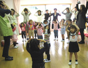 年長組ともなると、お母様の前だからと様子が変わることなく、普段通りの活動をご覧いただくことができました。体を使ったゲームでは、親子共々楽しく取り組むことができました。似顔絵のプレゼントと共にみんなの前でお母様が作ってくださる好きな料理を発表する場面では、温かい親子の日常が良くみてとれました。