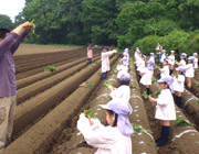 年長組が川越でさつまいもの苗付けを行い、石灰で目印のつけられた畑に、1人8本の苗を植えました。農家の方からうねを崩さないように気をつけること、苗を優しく手に持ち、茎の部分をこぶし2個分くらい埋め、その中心を指でぎゅっと押し付けるようにと教えていただき、皆夢中で作業しました。植えた場所を先生が書き記し、秋には自分が植えた苗からさつまいもを収獲することになっています。