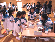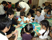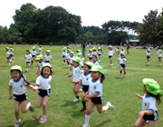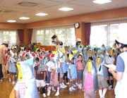 年長組がお母様と一緒に、川村小学校2年生の縁日あそびに招待をしていただきました。会場の小学校体育館に少し緊張しながら入ると、2年生が元気良く出迎えてくれ、一気に表情が明るくなりました。全部で15箇所の縁日を時間いっぱい回ると、お姉さんが一生懸命作っておいてくれた景品をたくさんもらうことができ、みな嬉しそうでした。 |