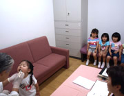 虫歯予防デーの6月4日、歯科検診が行われました。年少組の園児は緊張している様子でしたが、元気よく先生に名前を告げ、口を大きく開けることができました。検診が終わりオッケーと先生に言われると、いつもの笑顔が戻り、大きな声でお礼を言っていました。