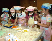 年長組は、初めてのお料理教室でフルーツゼリーを作りました。エプロン・三角巾・マスクをつけ、紙芝居で作り方の説明を受けた後、ゆうぎ室へ移動しました。ゼリー液ができると、ついに園児の出番です。包丁を慎重に扱ってフルーツを切り、カップの中に決められた数だけ入れました。先生がゼリー液を流し入れ、冷蔵庫で冷やして完成。お昼においしくいただき、大満足のお料理教室でした。 |
