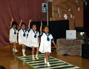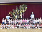 夏休み前の7・8月生まれのお誕生会の様子。誕生者はみんなの前に出て、お祝いをしてもらいました。年少組は4歳、年中組は5歳、年長組は6歳になり、また一つお姉さんになる喜びをかみしめています。 |