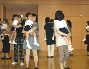 年少組は、はじめての親子体操教室が行われました。準備体操や柔軟体操をしていると、楽しい時間はあっという間に過ぎていきました。体操教室の後は、キンダーファミリーパーティーで行うフォークダンスの練習を行い、最後はおうちの方にギューッと抱きしめてもらいました。