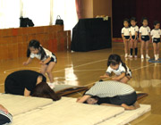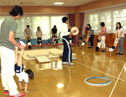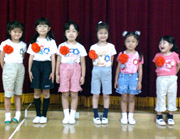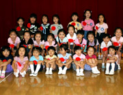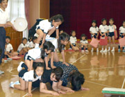 年長組のお友だちは、おうちの方を目の前にいささか緊張気味でしたが、準備体操のあとに太鼓のリズムにあわせて体を動かすと、その緊張もだんだんとほぐれていきました。おうちの方にお手伝いいただきながら立ったまま後ろに反りかえるブリッジにもチャレンジし、大きく成長した姿をご覧いただきました。おわりに、先生がならした太鼓の数にあわせてグループを作り、おうちの方と一緒に、キンダーファミリーパーティーで挑戦するピラミッドを作りました。 |