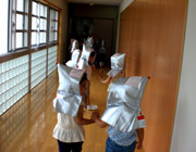 地震が発生し、ゆうぎ室まで避難するという想定で行われました。園児たちは机や椅子の下に頭を入れて地震がおさまるのを待ちました。その後、防災頭巾をかぶり二人一組となった園児たちは、放送の指示に従いながら落ち着いた様子で各教室からゆうぎ室へ避難を開始しました。 |