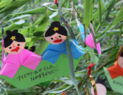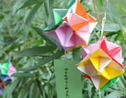 みんなの願い事を書いた短冊や色とりどりの折り紙で作った七夕飾りを笹に飾り付けました。7月7日が晴れて彦星と織姫が会えるといいですね。 |