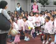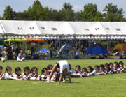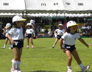 年長組の組体操は、完成度が高く、太鼓の音に合わせた機敏な動きに、会場からはため息とも歓声ともつかない声が聞こえてきました。後半のお城・ウェーブ・ドミノでは、体操の先生からも、その場でお褒めの言葉をいただくほどの演技でした。 |