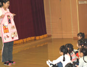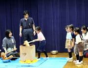 お店やさん(おはな、でんき、おもちゃ、アクセサリー、ペット、おかし)には、一つひとつ手作りの商品が並びました。「準備はいいですか?」という問いかけに「もういいよ!」と応えると、お客さんのおともだちは元気いっぱい会場に入りました。そこでは「いらっしゃいませ!」と大きな声で呼び込みをする店員さんの姿が見られました。一人350円分の買い物を楽しんだ後、みんなのお持ち帰り袋がいっぱいになりました。最後に、年少・年中組のおともだちがごあいさつをすると、年長組のおともだちは「どういたしまして!」とはにかんだ様子でした。 |
