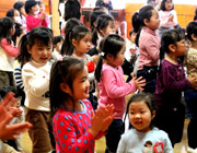 年少・年中組の演目のあと年長組は、「またあえる日まで」「変わらないように・・・」の2曲を発表しました。幼稚園でのお友だちや先生方との大切な思い出、そして、これから小学校入学への期待と不安を胸に元気よく熱唱しました。 |