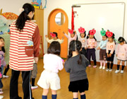 4月に入園するお友だちの一日入園が行われました。初めは緊張していたお友だちも、年長組のお姉さんがやさしく声をかけて手をひいてあげると、楽しいそうに笑いながら一緒に遊び始めました。 |