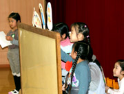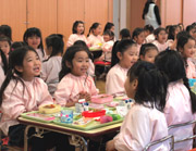 2月・3月生まれのお友だちをお祝いしました。先生方から一人ひとり紹介され、この一年で言動がお姉さんになったとお褒めの言葉をいただきました。今回のお楽しみの時間は、年長組によるペープサート(紙人形劇)です。各組3班に分かれ、自分たちで演目や配役を決めました。今日の班は「白雪姫」と「不思議な国のアリス」を上演しました。みんな身を乗り出して楽しそうに観ていました。 |