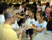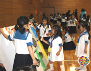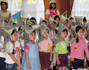 年長組が小学校2年生の縁日あそびに招待してもらい、おうちの方と一緒に小学校体育館で楽しいひとときを過ごしました。手づくりの縁日は遊び方が難しいものもあるので、お姉さんの説明を良く聞いて真剣に取り組む姿がみられました。心を込めて作ってくれた賞品がお持ち帰り袋にいっぱいたまり、大喜びのうちに縁日あそびを終えました。 |