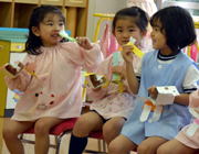 入園式からおよそ2ケ月。土曜参観ではいろいろなことが自分でできるようになった様子をご覧いただきました。親子製作では、上手にハサミを使って紙を切りクレヨンで絵を描いて旗を作りました。また、おうちの方のひざの上に乗ってハンドルをきりながら、楽しい音楽に合わせて「バスに乗って」を歌いました。先生から「年少さんという今、このときに描くおうちの方の似顔絵は今しかありません。」という言葉が印象的で、クレープ紙で作ったうちわと合わせてプレゼントしました。