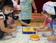 保育室でエプロン・三角巾・マスクを着けた園児たちは、先生からゼリーの作り方を聞き、お料理教室の準備が整いました。一回目のお料理教室は、パイナップル・ピーチ・みかんが入ったカラフルなフルーツゼリーを作ります。パイナップルとピーチを食べやすい大きさに包丁で切り、それぞれ好きなフルーツをカップに入れ、最後に先生がゼリー液入りのシロップを入れてくれました。お弁当の時間に、冷蔵庫で冷やしたゼリーにさくらんぼをのせて、美味しく食べました。