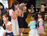 6月生まれのお友だちをお祝いし、3人はみんなの前で照れながらもきちんと将来の夢を発表できました。記念撮影が終わると、日本昔話の「七夕さま」を鑑賞しました。七夕飾りを製作しているところなので、七夕にまつわるお話に興味深く見入っていました。最後は、キンダーファミリーパーティーにむけ練習中のダンスを全員で踊りました。