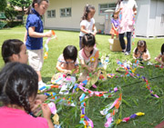 川村幼稚園の年長組では、毎年七夕かざりでくす玉作りに取り組んでいます。折り紙でそれぞれのパーツを作り、色合いを考えながら組み上げていきました。飾りつけも自分達で、笹の太いところを見つけ、片結びでしっかりと結ぶことができました。 |