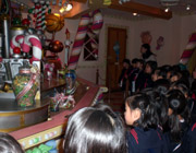 年長組全員で出かける最後の行事お別れ園外保育は電車で出かけました。車内マナーを守り、お友だちとお話しながら約1時間、園児たちが楽しみにしていたサンリオピューロランドへ到着しました。クラスごとにキティーちゃんと一緒に記念撮影やパレードを観て楽しみました。